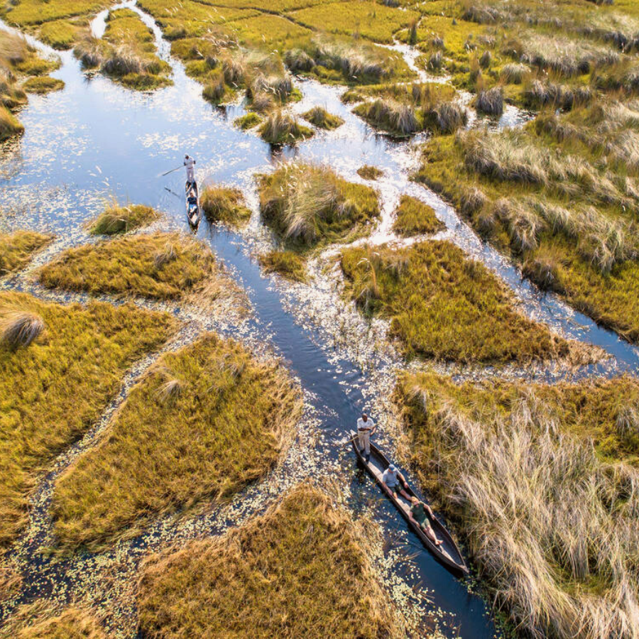 Safari activities are conducted on land, on water, and in the air and these range from wildlife viewing game drives, a dug-out canoe called a mokoro, boat cruises, and scenic helicopter flights.