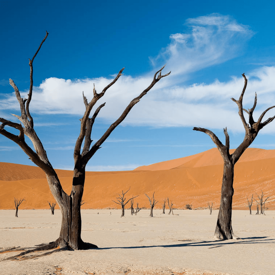 On the western side of Namibia, Namib Naukluft National Park is situated. It covers a wide area of 19,216 sq miles (49,768sq km). It is the largest National Park in Africa and ranks fourth in the world. Sossusvlei pan is one of the most frequently visited areas famous for its towering apricot-colored sand dunes. It can be reached by following the Tsauchab River valley. The other two frequently visited pan areas are Hiddenvlei and Deadvlei. Deadvlei’s striking camel thorn trees, starved from any drop of water, still stand erect where they once thrived. They survived until about 900 years ago when the sand sea finally blocked the river from occasionally flooding the pan. Sesriem Canyon is a narrow gorge, 1.5 km long and 30 meters deep, exposing layers of sedimentation deposited over millions of years.